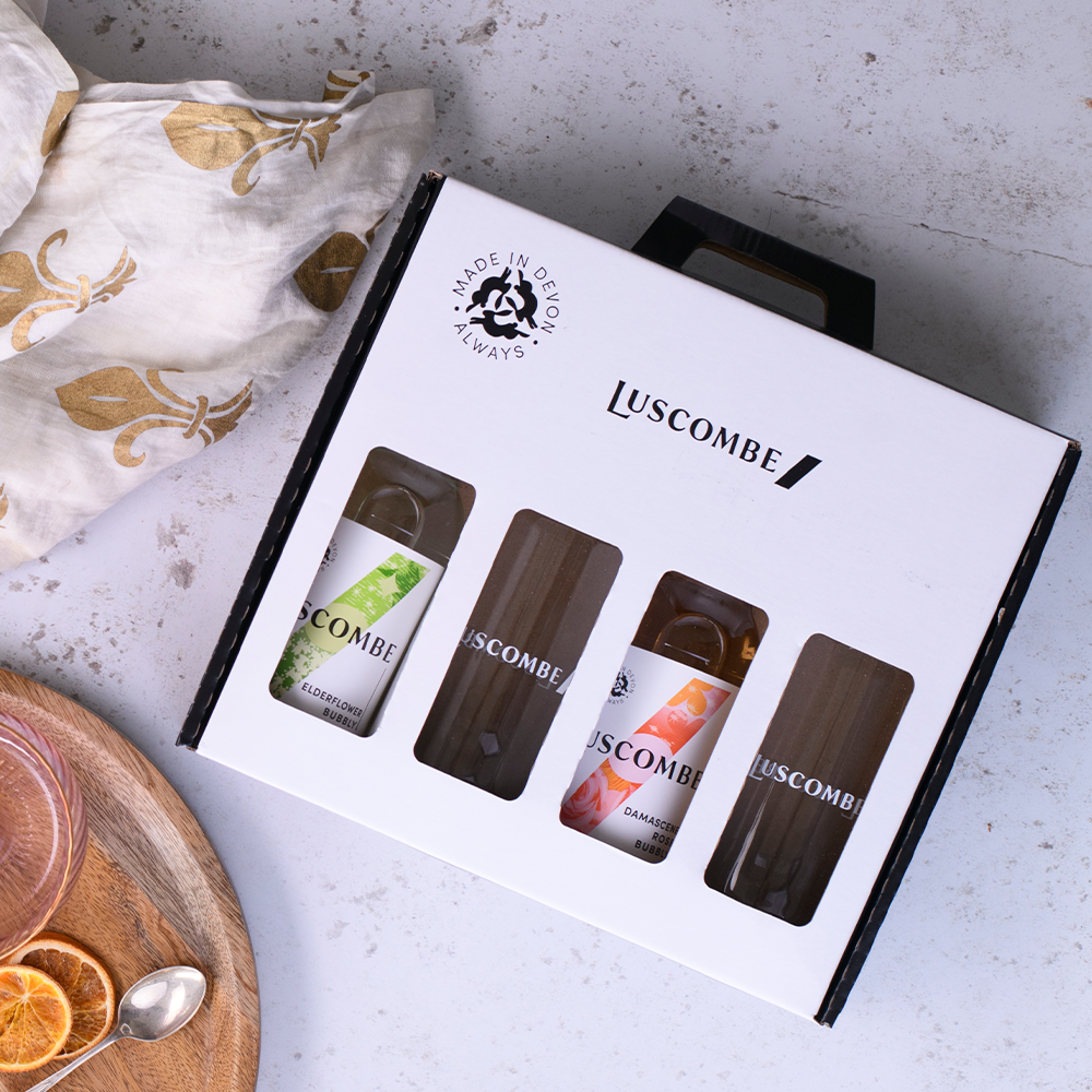 Two beautifully presented gift packs each featuring 1x Elderflower Bubbly, 1x Damascene Rose Bubbly and 2x premium Luscombe glasses. The perfect gifts for any celebration.
