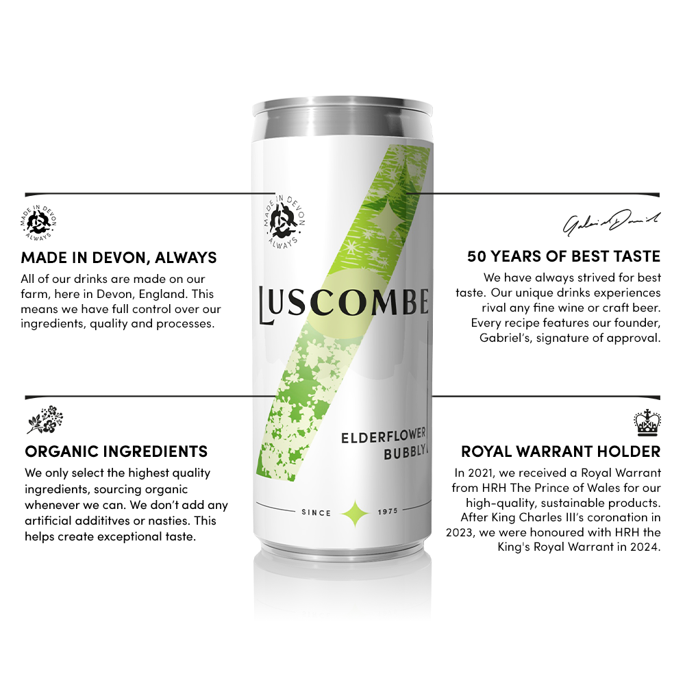 A gently sparkling blend of hand-picked elderflowers balanced with Sicilian lemons and soft Devon spring water, to create this long-time Luscombe favourite.